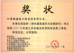 二O一六年度江苏省建设优秀科技成果三等奖
